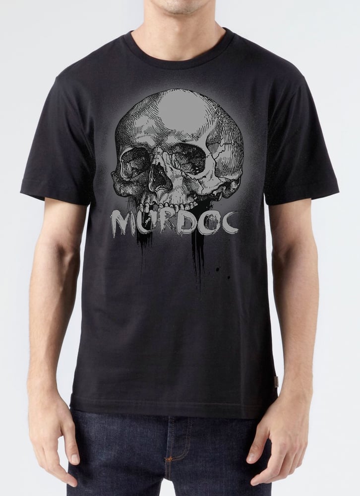 Black cotton shirt with hand drawn skull and Murdoc logo.